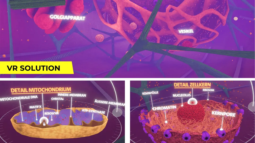 Embark on a virtual journey inside a living cell - virtual reality makes it possible! Move through the cell and look around, there is a lot to discover: The cell nucleus, which contains the genetic material, the mitochondria, which are the power plants of the cell and provide energy, the Golgi apparatus and many other components of the cell can be virtually cut and closely examined in an examination sphere. The inside of a cell is like a small cosmos full of fascinating surprises