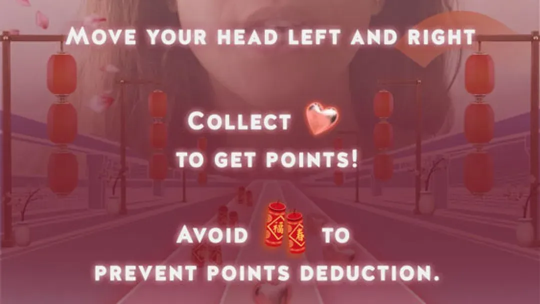 Players dodge firecracker obstacles, collect hearts, and compete for prizes.