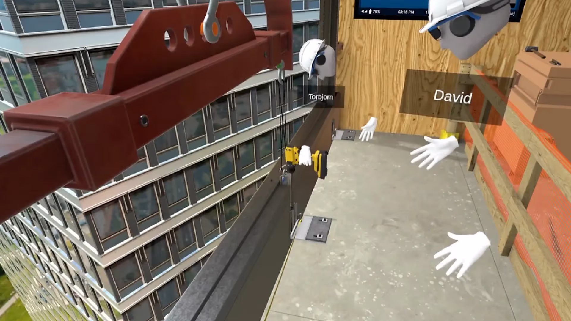 In this VR simulation, participants immerse themselves in a virtual construction site. They engage in hands-on activities such as mixing joint compound for drywall finishing and using a "tape bazooka" to tape drywall seams. They also practice painting techniques, including applying masking tape, using a paintbrush, and spray painting. For those interested in glazing, there's a module where they experience standing on the 25th floor of a skyscraper, guiding a curtain wall into position, providing a safe way to confront any fear of heights.